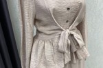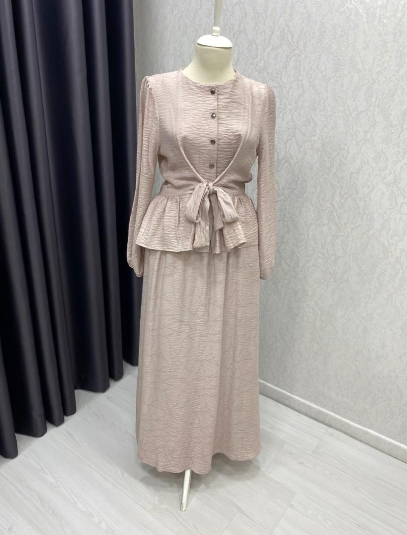 Yumuşak dokulu kumaşı sayesinde gün boyu konfor sunarken, bel kısmındaki kuşak detayı vücuda zarif bir form kazandırır. Üst parçadaki düğme detayları ve hafif fırfırlı kesimi ile sade şıklığı ön plana çıkarır.